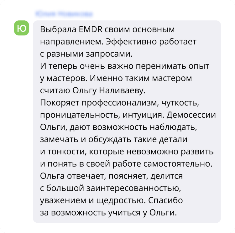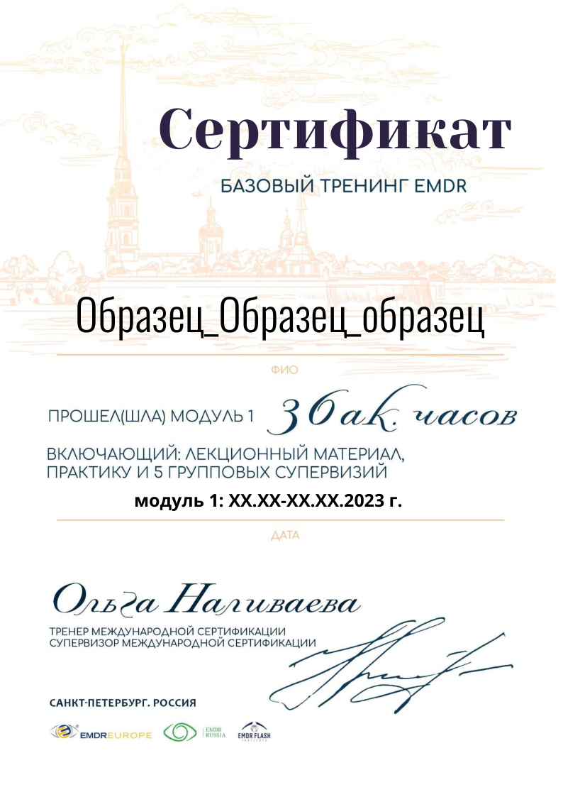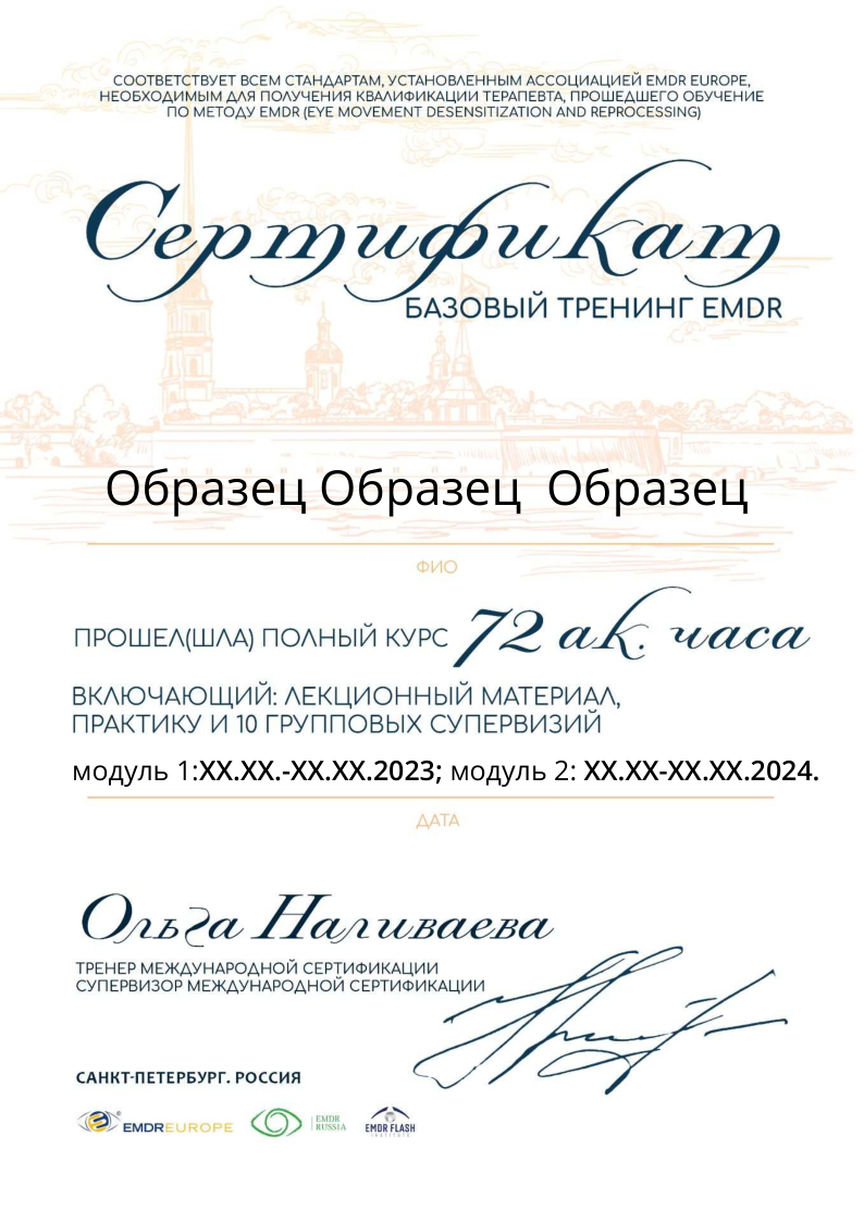 После прохождения теории, практики и 5 супервизий модуля 1 ученики получают сертификат от Ольги Наливаевой, при условии соответствия требованиям, перечисленным в блоке «Трек движения специалистов EMDR на сайте».