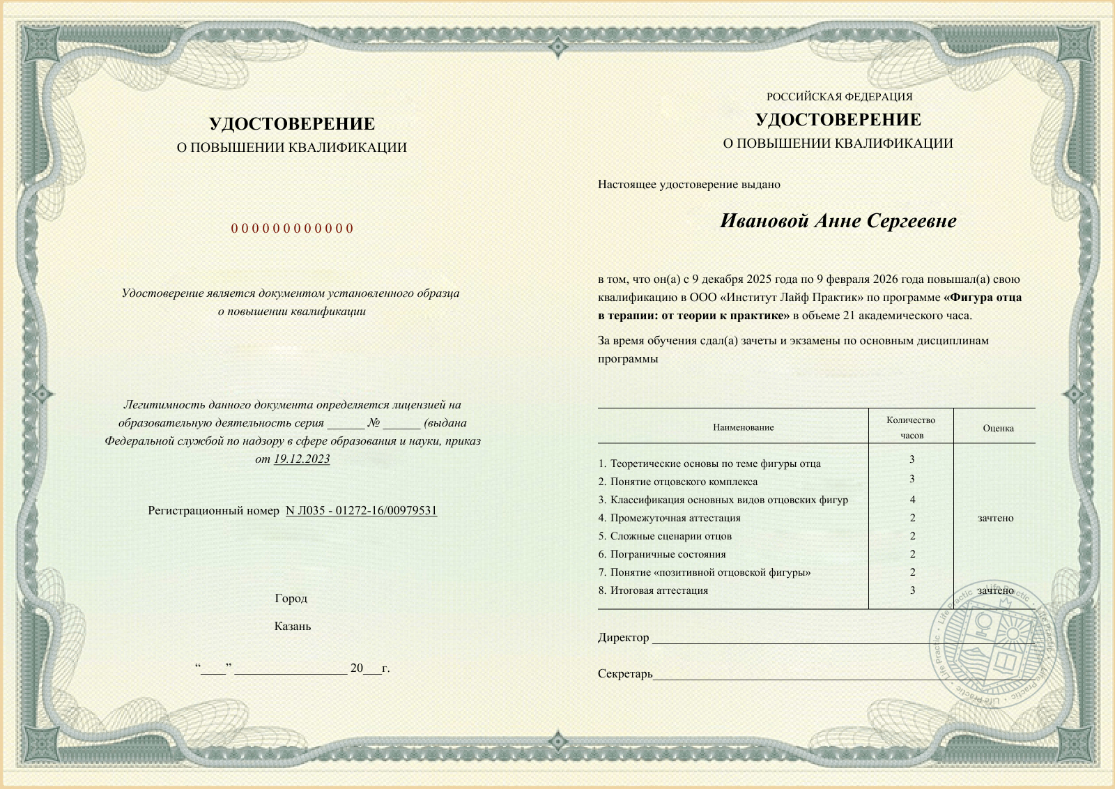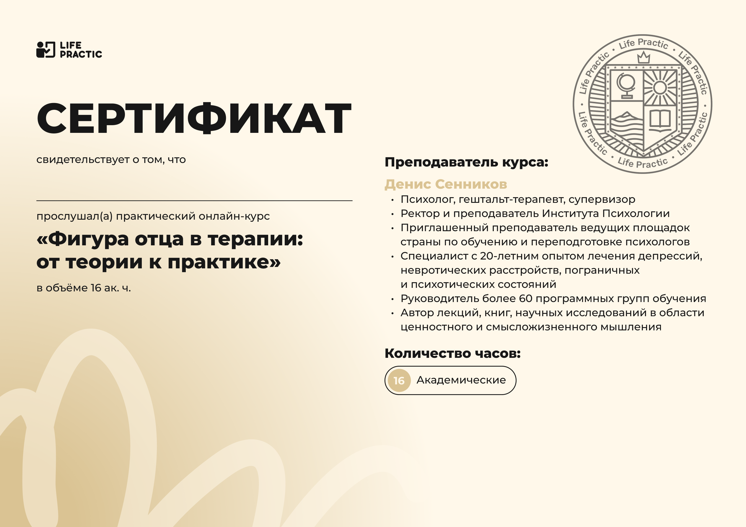 Все ученики получают сертификат участника от Life Practic с указанием часов и подписью автора.